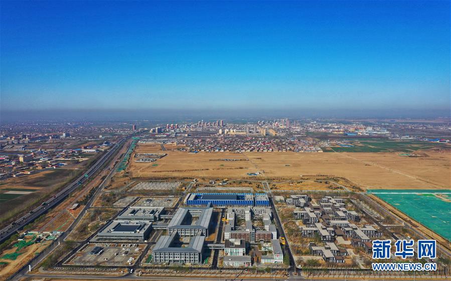 3月31日無(wú)人機(jī)拍攝的雄安新區(qū)市民服務(wù)中心(前)遠(yuǎn)處為容城縣城區(qū)。新華社記者牟宇攝