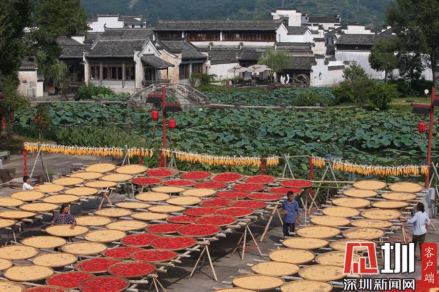 秋天,是收獲的季節(jié)。安徽省黃山市呈坎古村村民將收獲歸倉的玉米、黃豆、紅辣椒等農作物果實因地制宜晾曬,在古村曬場上描繪出一幅豐收曬秋圖。