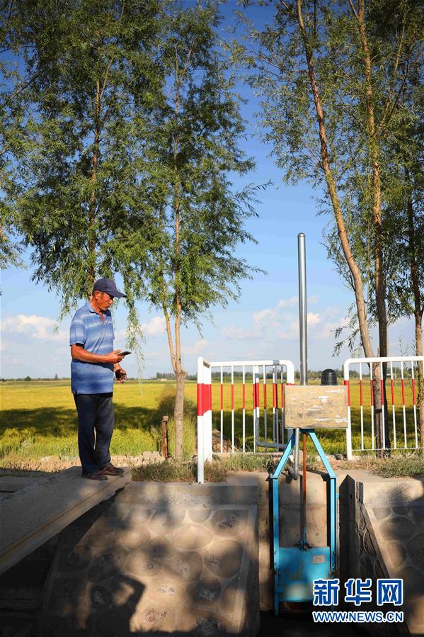 銀川市賀蘭縣常信鄉(xiāng)潭渠村村民用水協(xié)會會長孫萬銀輕點(diǎn)手機(jī),灌溉支渠上的水閘緩緩升起(9月1日攝)。新華社記者劉詩平攝