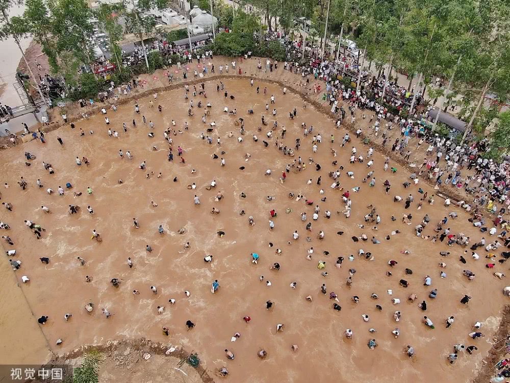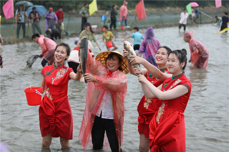 2019年9月7日,重慶,涪陵區(qū)曬秋捉魚活動在紅酒小鎮(zhèn)舉行,現(xiàn)場上演搶魚“大戰(zhàn)”。