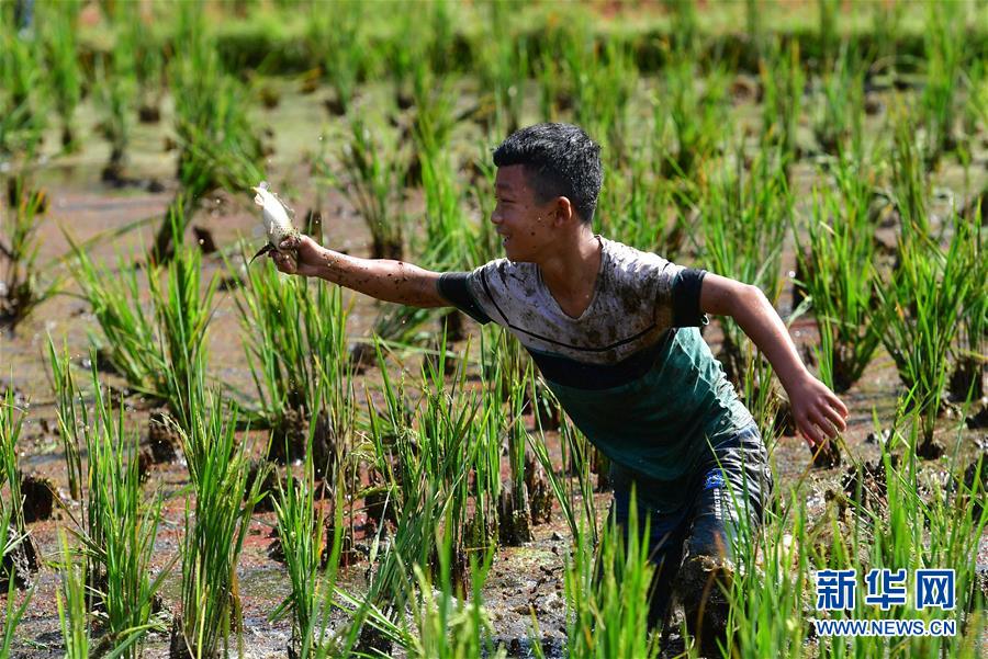 9月15日,人們在稻田里參加摸魚比賽。 新華社記者 楊宗友 攝