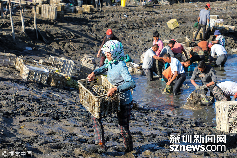 2018年9月8日,遼寧丹東,早上5點(diǎn),挖蟶人紛紛下到各個(gè)池子,要在海水海泥里艱辛勞作10小時(shí),直至下午3點(diǎn)集體上岸,等待買家的運(yùn)輸車隊(duì)運(yùn)走他們的勞動(dòng)成果。9月初,遼寧沿海養(yǎng)殖區(qū)進(jìn)入養(yǎng)殖海鮮的收獲季。在東港,常常出現(xiàn)數(shù)百人乃至上千人集結(jié)在池子里挖蟶子(這里特指縊蟶,即東港當(dāng)?shù)厝怂f(shuō)的小人仙。下同)的壯觀景象。在養(yǎng)殖海鮮的收獲季,成群的海鷗趁機(jī)“助陣“,人與大自然和諧共處的畫(huà)面令人嘆為觀止。