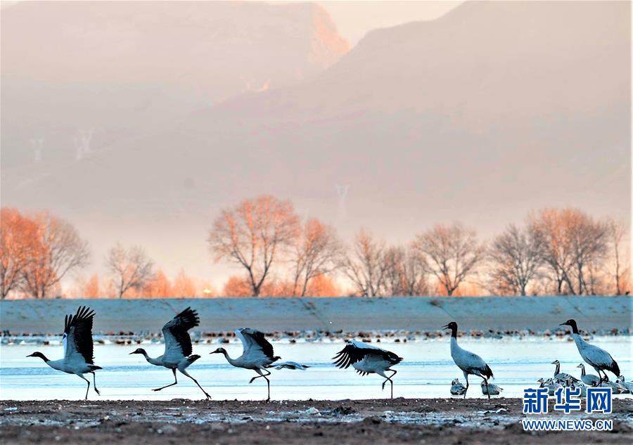西藏拉薩市林周縣境內(nèi)的黑頸鶴(2017年1月16日攝)。新華社記者張汝鋒攝