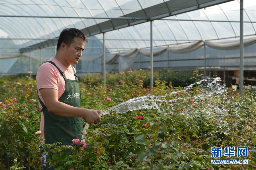 在沭陽縣新河鎮(zhèn)新槐村,張炎在花卉大棚內(nèi)給月季花澆水(8月24日攝)。 新華社記者 任鵬飛 攝
