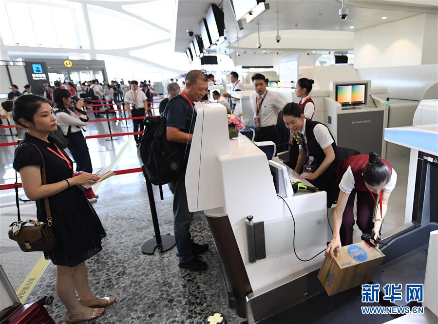 9月25日,工作人員在北京大興國際機(jī)場為乘客辦理行李托運(yùn)。新華社記者張晨霖?cái)z