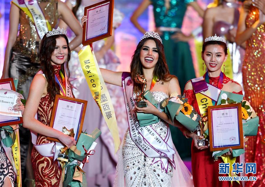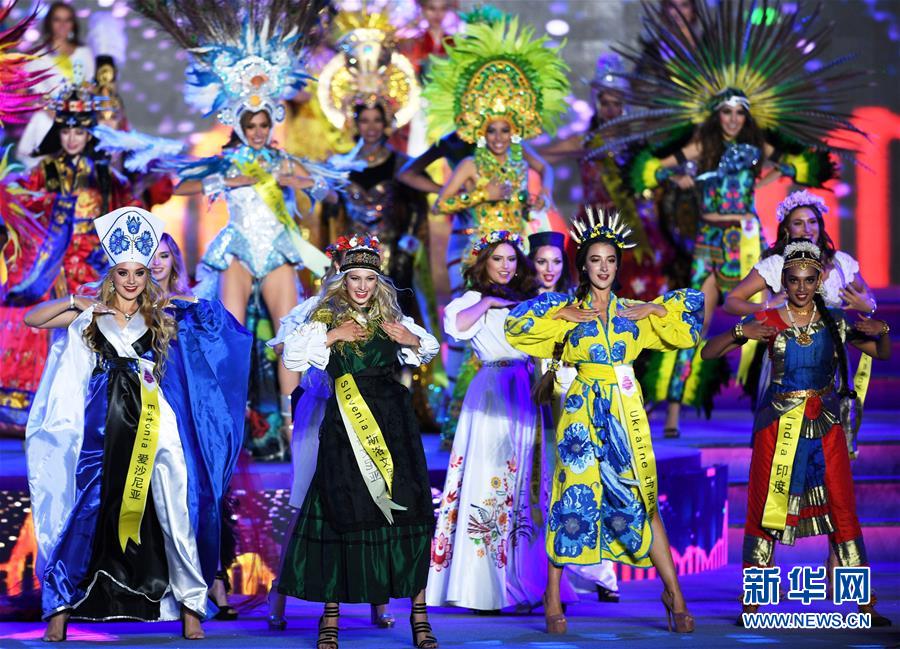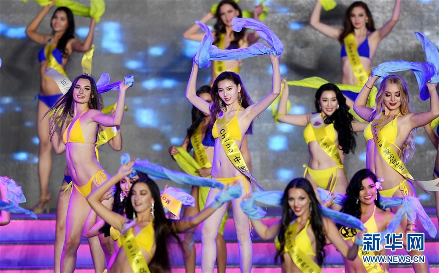 10月6日,選手在頒獎儀式上。 10月6日晚,2019世界旅游小姐全球總決賽頒獎盛典在山東青島舉行。來自67個國家和地區(qū)的佳麗在民族服裝、泳裝、晚裝以及才藝展示環(huán)節(jié)各展風(fēng)采,最終來自墨西哥和加拿大的兩名選手分獲冠亞軍,中國選手譚若依獲得季軍。 新華社記者 李紫恒 攝
