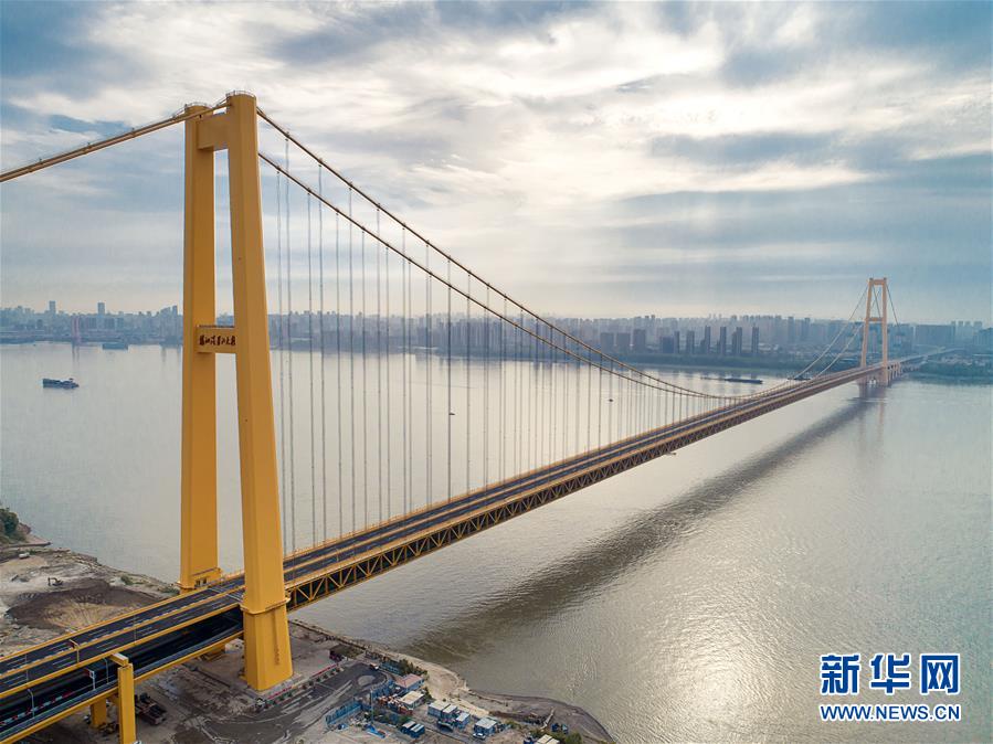 楊泗港大橋建設(shè)創(chuàng)造了多項世界之最:一是主橋跨度達1700米,為世界上跨度最大的雙層懸索橋;二是主橋設(shè)置雙層雙向12車道,是世界上通行能力最大的公路橋梁;三是大橋主纜設(shè)計張力6.5萬噸,采用了世界上強度等級最高的主纜鋼絲;四是大橋設(shè)置機動車道、非機動車道、人行觀光道,集過江交通與觀光于一體,是長江上功能最完備的橋梁。新華社記者熊琦攝