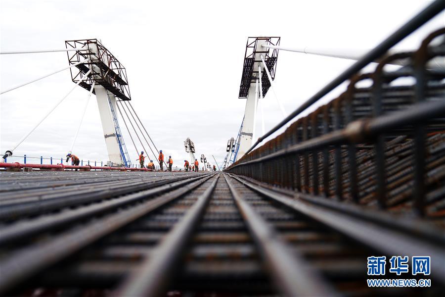 工人在大橋上進(jìn)行橋面鋪裝施工作業(yè)(8月19日攝)。新華社記者 王建威 攝
