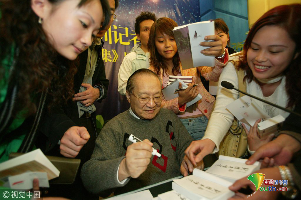 2005年12月17上午,中國南北文壇兩位大俠金庸和二月河在深圳五洲賓館和各地記者進(jìn)行了一場精彩對(duì)話。金庸迷找金庸簽名。圖片作者:北辰