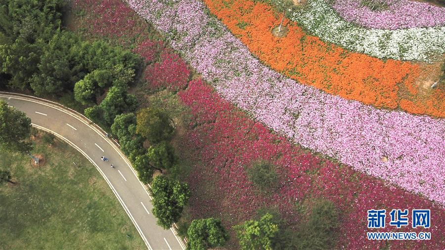 10月9日無人機拍攝的四季花海城市公園風景。 秋日時節(jié),位于安徽省合肥市的四季花海城市公園花香四溢,色彩繽紛,成為游客和市民休閑游玩的好去處。 新華社記者 張端 攝