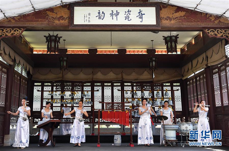 在江西景德鎮(zhèn)古窯民俗博覽區(qū),演員們用瓷制樂器進(jìn)行“瓷樂”表演(2018年9月20日攝)。新華社記者 萬象 攝
