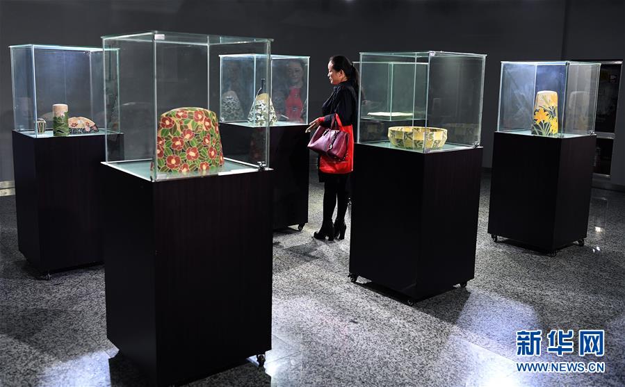 參觀者在江西景德鎮(zhèn)美術(shù)館參觀“笠間燒”日本陶藝家的作品展(2018年10月19日攝)。新華社記者 萬象 攝