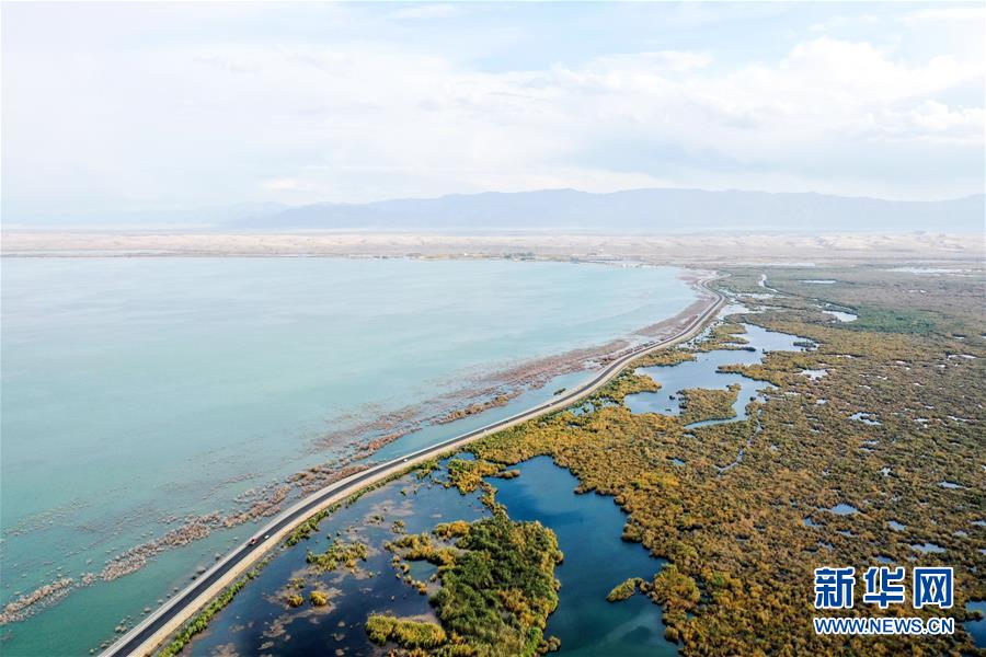 這是新疆博斯騰湖美景(10月12日無(wú)人機(jī)拍攝)。入秋以來(lái),新疆博斯騰湖碧波蕩漾,美景如畫(huà),吸引各地游客前來(lái)游玩。新華社記者丁磊攝
