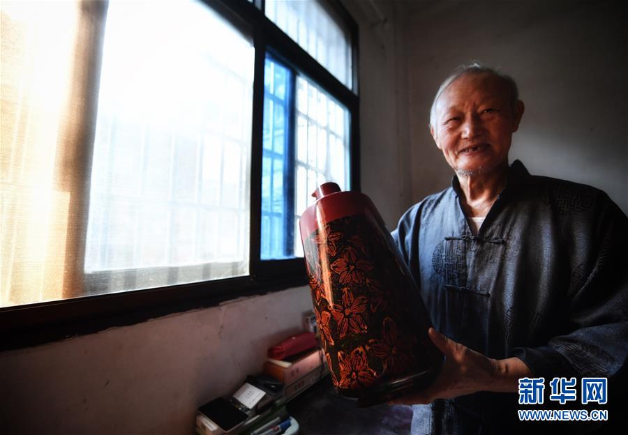 10月12日,丁國坤在家中展示他最喜歡的一件脫胎漆器作品《花非花》。新華社記者胡晨歡攝