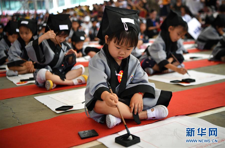 10月13日,參加儀式的小朋友在蘸墨寫字。當(dāng)日,海口胡畫少兒藝術(shù)中心為500名小朋友舉行“開筆禮”,通過“點朱砂,啟智慧”“習(xí)書法,描人字”等儀式讓孩子們體驗中國傳統(tǒng)文化。新華社記者郭程攝