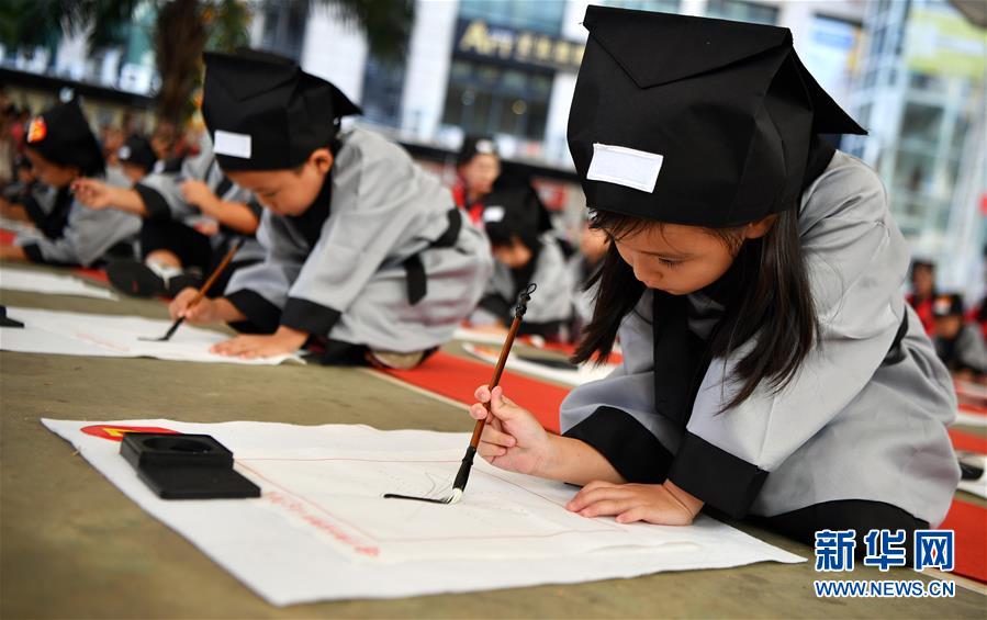 10月13日,參加儀式的小朋友在書寫“人”字。當(dāng)日,??诤嬌賰核囆g(shù)中心為500名小朋友舉行“開筆禮”,通過“點(diǎn)朱砂,啟智慧”“習(xí)書法,描人字”等儀式讓孩子們體驗(yàn)中國傳統(tǒng)文化。新華社記者郭程攝