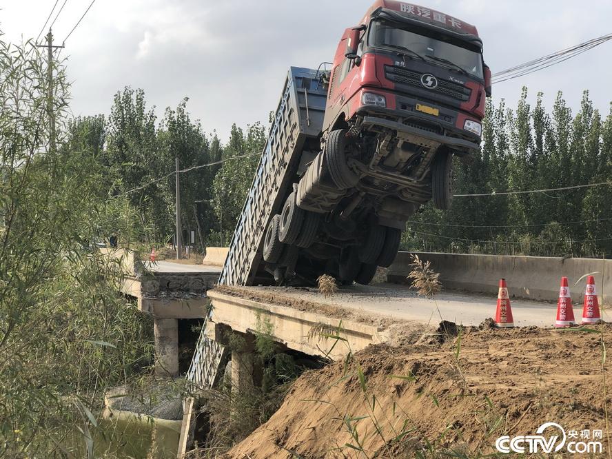 央視網(wǎng)消息:2019年10月13日,山東濱州,一輛滿載貨物的大貨車(chē)路過(guò)當(dāng)?shù)匾蛔鶎?米左右的小橋時(shí),致使橋面坍塌。據(jù)報(bào)道,13日凌晨4點(diǎn)左右,一輛重型半掛貨車(chē)沿渤海十八路由南向北行駛至市西辦事處李茂家村附近,右轉(zhuǎn)彎進(jìn)入連接渤海十八路與李茂家村村西鄉(xiāng)間路的一座寬4米左右的小橋時(shí),致使橋面坍塌?,F(xiàn)場(chǎng)貨車(chē)呈翹起之勢(shì),車(chē)頭懸于半空中,車(chē)尾插入水中,事故未造成人員傷亡。據(jù)現(xiàn)場(chǎng)了解,該橋建設(shè)于1974年,橋頭有警示標(biāo)識(shí),警示承載4噸。目前救援工作正在緊張有序地進(jìn)行中。視覺(jué)中國(guó)