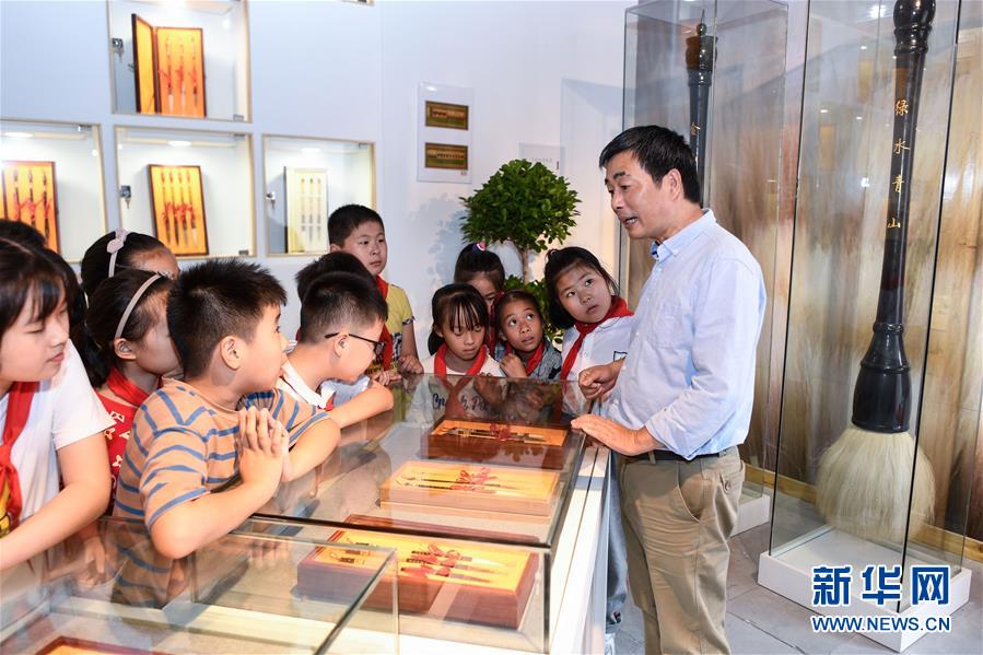 10月14日,小學(xué)生在非遺活態(tài)傳承館觀看湖筆的實(shí)物展示。新華社記者 黃宗治 攝