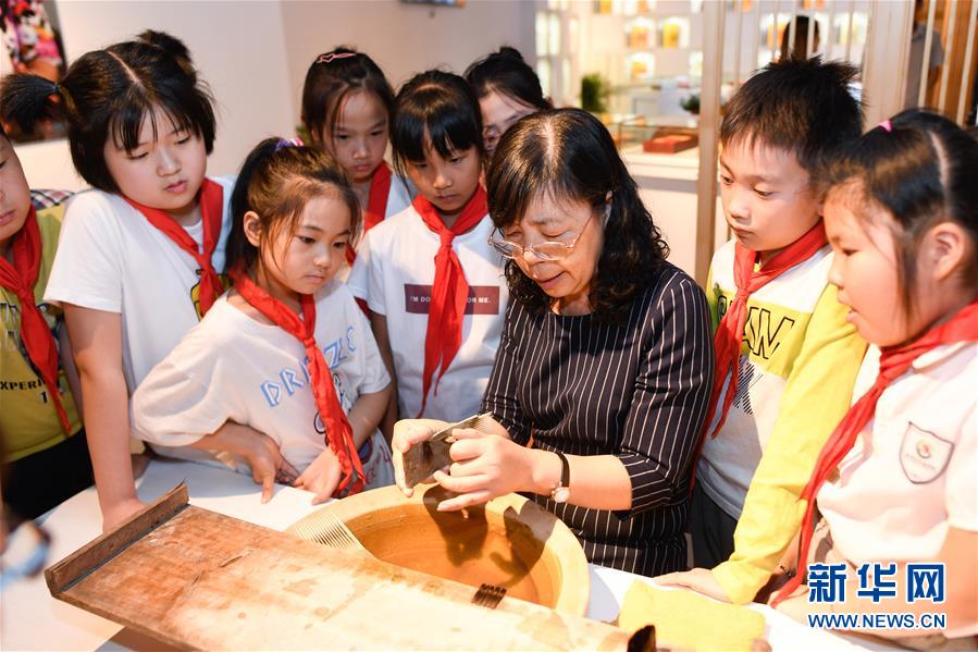 10月14日,小學(xué)生在非遺活態(tài)傳承館使用湖筆練習(xí)書法。 新華社記者 黃宗治 攝