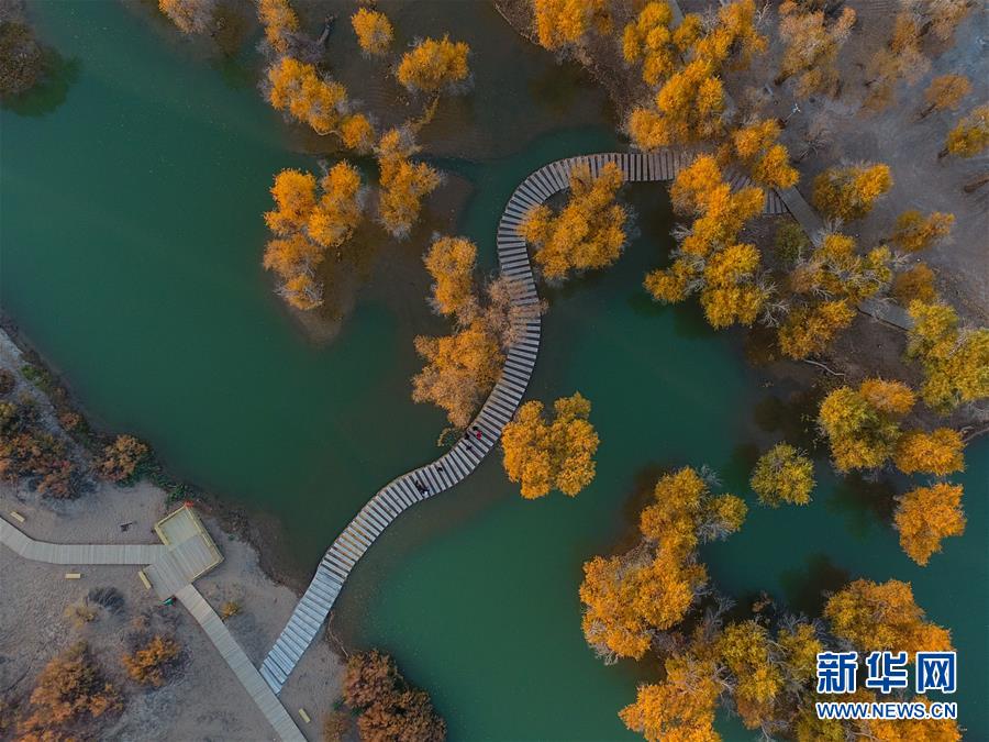 這是在內(nèi)蒙古自治區(qū)額濟(jì)納旗拍攝的胡楊林(10月10日無人機(jī)拍攝)。金秋時節(jié),內(nèi)蒙古自治區(qū)額濟(jì)納旗胡楊林如同披上金裝,成為大漠中的一抹亮色,吸引眾多中外游客前來觀賞游玩。新華社記者劉磊攝