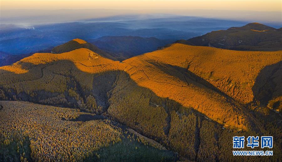 朝霞映照下的好地方林場(10月8日無人機拍攝)。新華社記者陶明攝