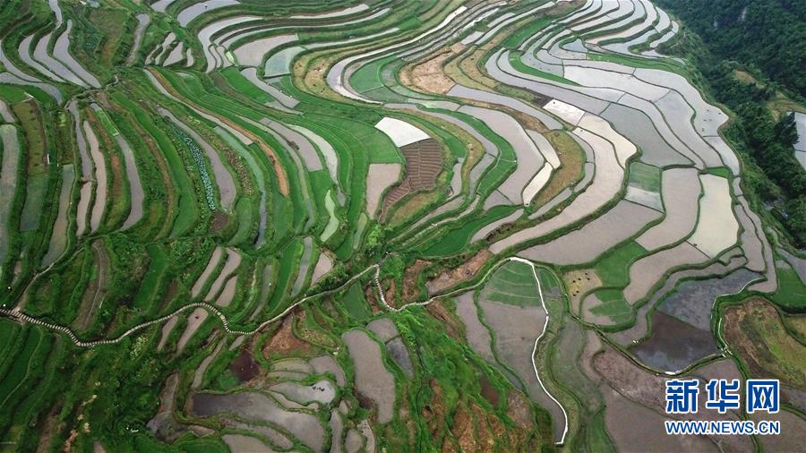 這是5月18日無(wú)人機(jī)拍攝的貴州省丹寨縣龍泉鎮(zhèn)高要梯田。初夏時(shí)節(jié),位于貴州省丹寨縣龍泉鎮(zhèn)的高要梯田景色優(yōu)美。新華社記者楊文斌攝