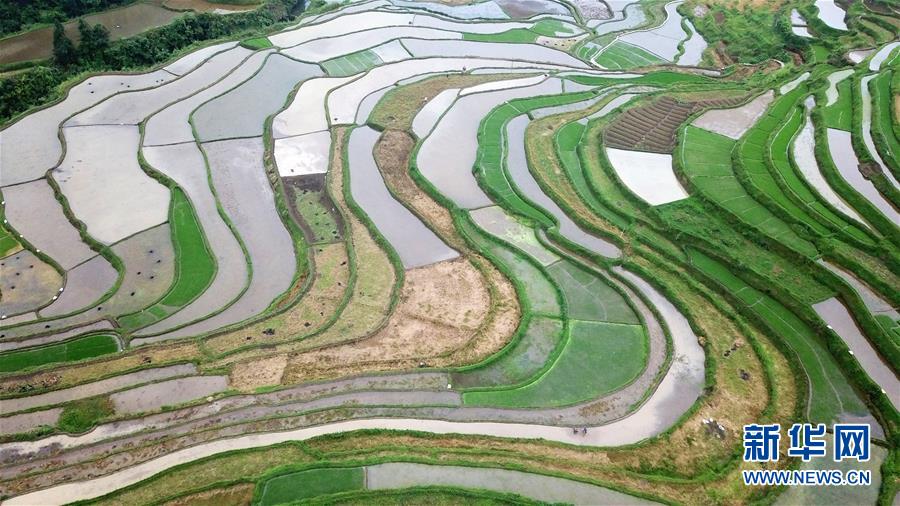 5月18日,農(nóng)民在貴州省丹寨縣龍泉鎮(zhèn)高要梯田里耕作(無人機(jī)拍攝)。初夏時節(jié),位于貴州省丹寨縣龍泉鎮(zhèn)的高要梯田景色優(yōu)美。新華社記者楊文斌攝