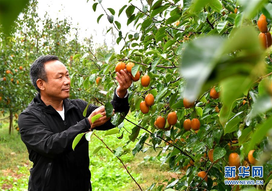 種植戶李應(yīng)賢在河南省洛寧縣馬店鎮(zhèn)關(guān)廟村查看金珠沙梨生長情況(10月9日攝)。新華社記者李嘉南攝