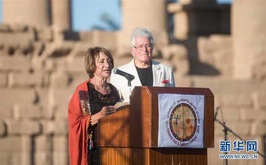 10月27日,在位于埃及阿斯旺的菲萊神廟,中非藝術節(jié)創(chuàng)始人蘇海爾·阿卜杜勒-卡迪爾在開幕式上發(fā)言。 新華社記者 鄔惠我 攝