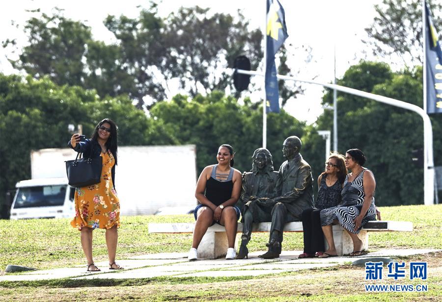 11月8日,在巴西首都巴西利亞,游客在庫(kù)比契克紀(jì)念館前與巴西前總統(tǒng)庫(kù)比契克夫婦的雕像合影。新華社記者 蘭紅光 攝