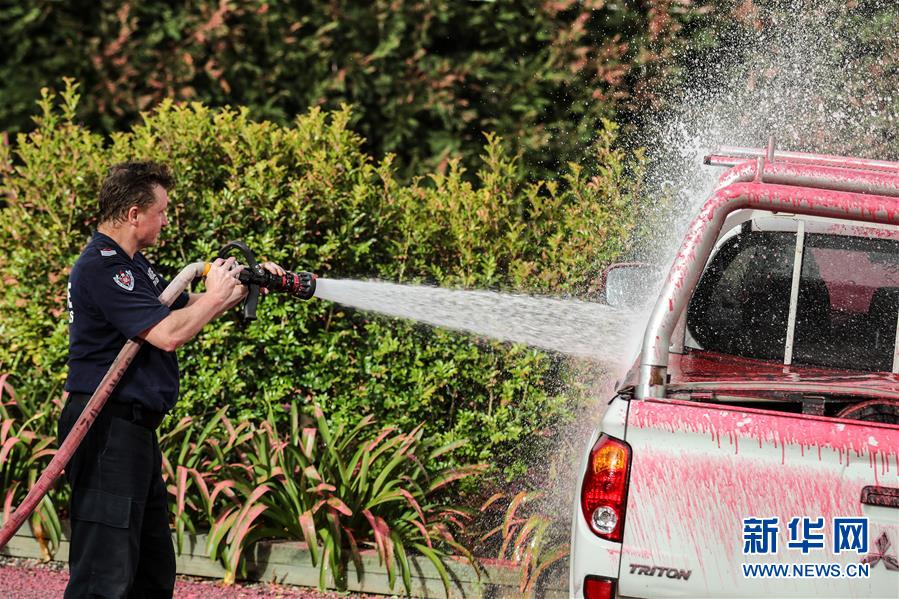 11月12日,在澳大利亞悉尼附近的南塔勒馬拉,消防員在滅火后清洗車輛上的滅火劑。新華社記者白雪飛攝