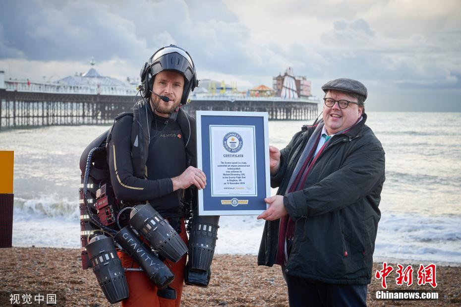 11月18日訊,英國(guó)布萊頓,英國(guó)發(fā)明家理查德·布朗寧穿著一套由身體控制、噴氣發(fā)動(dòng)機(jī)驅(qū)動(dòng)、風(fēng)力導(dǎo)向的飛行服,以高達(dá)每小時(shí)85.06英里(約137公里)的飛行速度,打破了自己創(chuàng)下的噴氣式飛行服速度的吉尼斯世界紀(jì)錄。圖為工作人員為理查德·布朗寧頒獎(jiǎng)。圖片來源:視覺中國(guó)