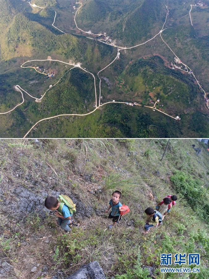 拼版照片:上圖為剛剛修通公路的大化瑤族自治縣板升鄉(xiāng)八好村弄麻屯(11月11日無人機(jī)拍攝);下圖為在尚未通路的八好村弄麻屯,孩子們爬山路回家(2016年9月23日攝)。新華社記者黃孝邦攝