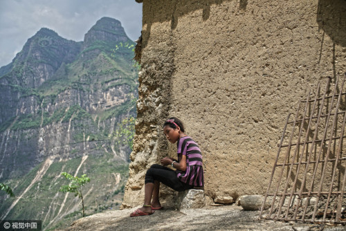 四川省涼山彝族自治州昭覺縣支爾莫鄉(xiāng)阿土勒爾村,是一座名副其實(shí)的“懸崖村”,72戶人家居住在這里,處于美姑河大峽谷斷坎巖肩斜臺(tái)地,海拔1400多米,與地面垂直距離約800米。5月14日,放學(xué)路上,孩子們?cè)谂逝捞偬?。圖片來源:視覺中國