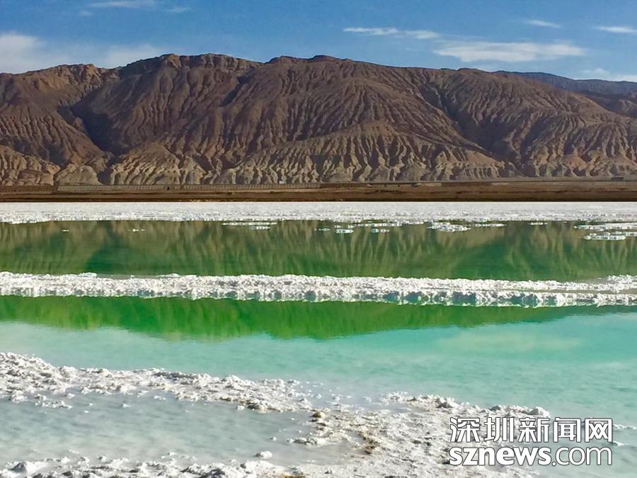 在青海柴達(dá)木盆地最西部的茫崖有一處硫酸鎂亞型人工鹽湖,以其翡翠綠色的鹽田與藍(lán)天白云和附近的丹霞地貌相映。李仁奇攝