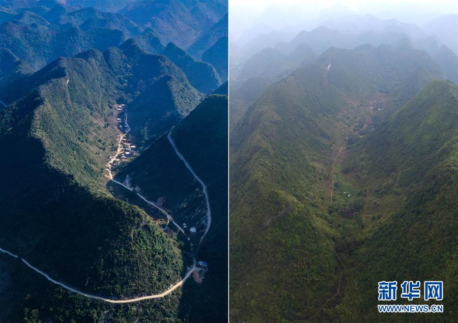 拼版照片:左圖為剛剛修通水泥路的大化瑤族自治縣板升鄉(xiāng)八好村弄研屯(11月11日無人機(jī)拍攝);右圖為尚未通路的八好村弄研屯(2015年11月3日無人機(jī)拍攝)。新華社記者黃孝邦攝