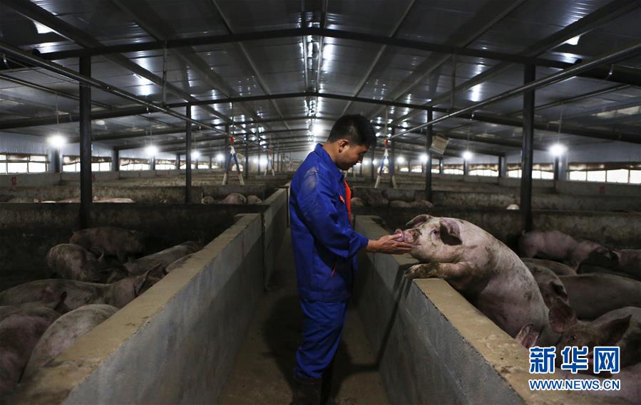 11月28日,在四川省德陽(yáng)市中江縣一生豬養(yǎng)殖場(chǎng),工作人員檢查豬的生長(zhǎng)情況。