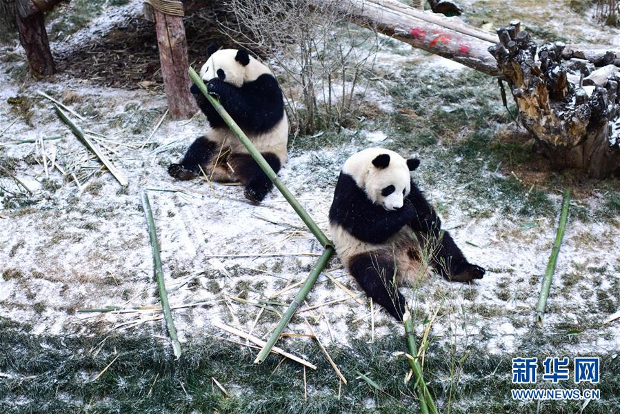 11月29日,在西寧熊貓館內(nèi),兩只大熊貓?jiān)诔灾褡印?當(dāng)日,青海省西寧市迎來降雪,西寧熊貓館四只“萌寵”大熊貓?jiān)谘┨炖锵硎苤灾褡拥臉啡?。?jù)了解,大熊貓生活的適宜溫度在26攝氏度至零下5攝氏度之間,冬季氣溫低于零下5攝氏度時(shí),場館會啟用保暖設(shè)施。 新華社記者 吳剛 攝