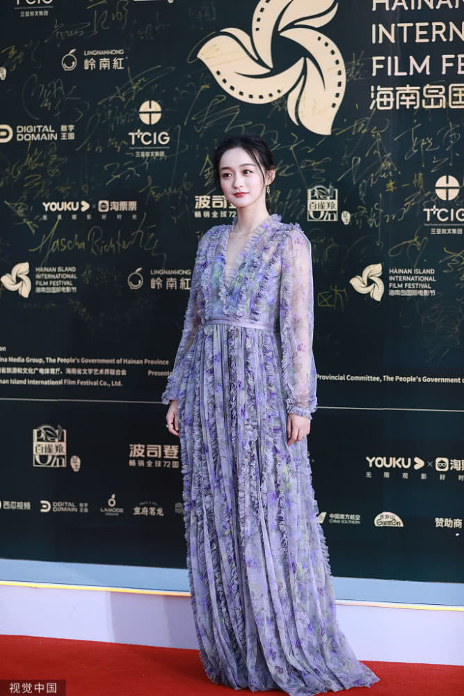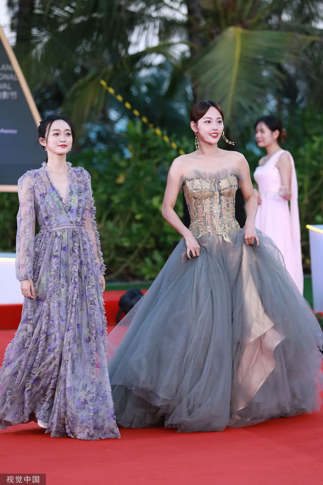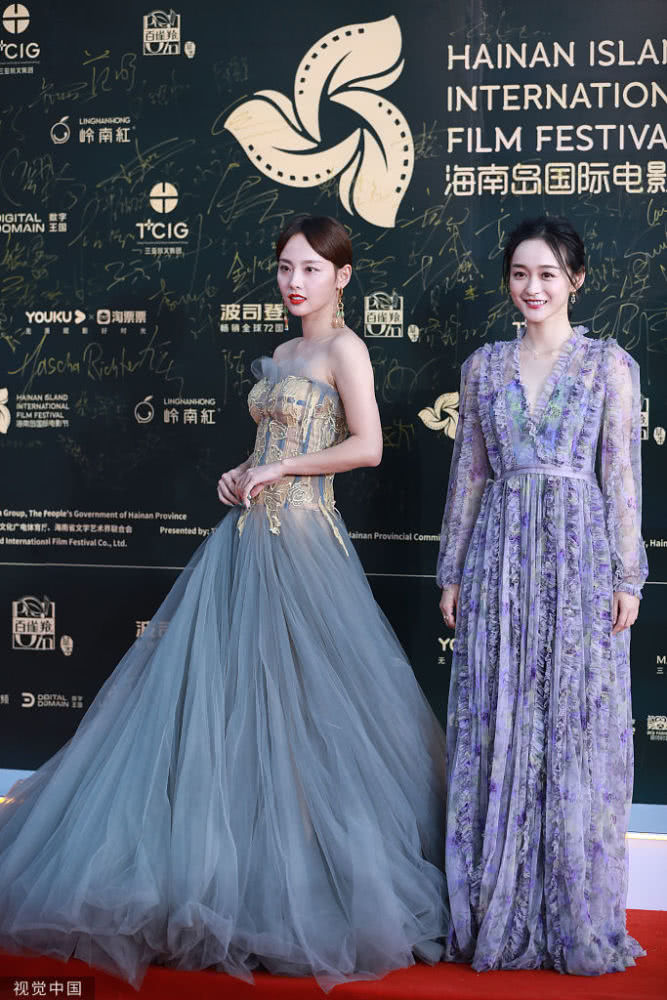 2019年12月1日,三亞,第二屆海南島國際電影節(jié)。何泓姍彎腰為張嘉倪整理裙擺,跟此前劇中傲嬌跋扈的“玫嬪”人設(shè)大不相同。