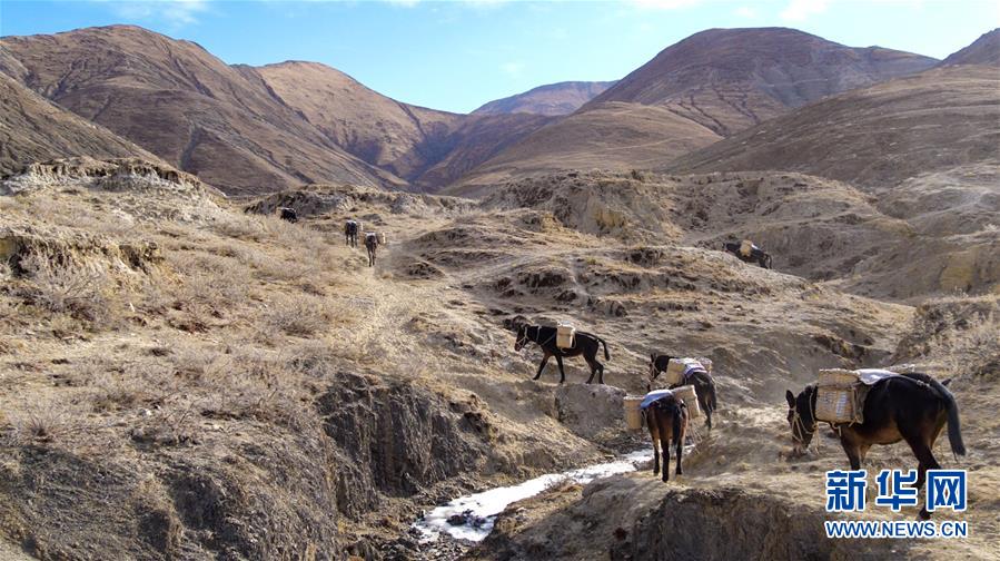 12月6日,騾馬隊(duì)馱負(fù)工程物料前往山頂塔基施工現(xiàn)場。新華社記者侯捷攝