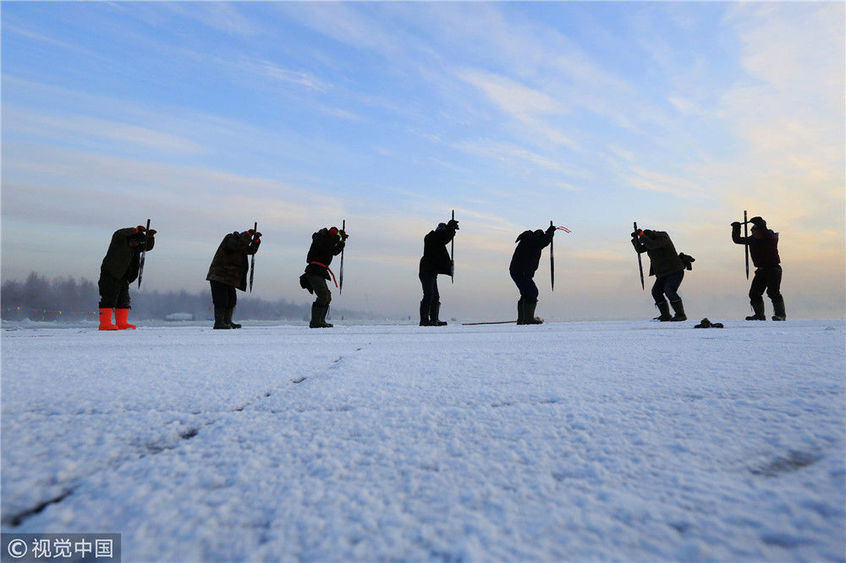 2018年12月11日,黑龍江省哈爾濱市,松花江上,采冰者們彎腰拉繩,宛如纖夫般拽重達半噸的冰塊出水。采冰者都是自哈市江北萬寶、東發(fā)、沙陀子等鄉(xiāng)鎮(zhèn)的農(nóng)民,他們每年冬閑時都會親屬、村鄰之間結(jié)伴到松花江畔采冰,有的采冰人,已經(jīng)連續(xù)干了二十多年。每個采冰季,他們每天要在冰面上工作10-12個小時,每個采冰組,一天要拽出冰塊2000-3000塊,一個近20天的采冰季,每人能收入近萬元。