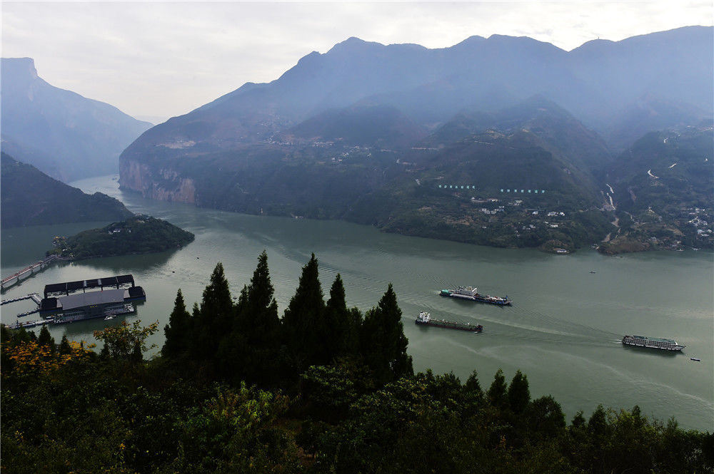 2019年11月2日,重慶,各種上行船舶正在通過(guò)白帝城前方的三峽夔門(mén),蓄水后貨暢其流、往來(lái)無(wú)阻的水運(yùn)業(yè)彰顯“黃金水道”的社會(huì)效益。
