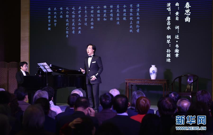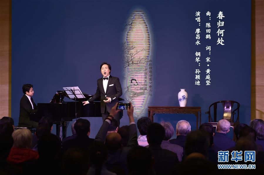 12月10日晚,廖昌永在音樂會上演唱《春歸何處》。 當晚,中國古典詩詞與書畫——廖昌永中國藝術歌曲獨唱音樂會在北京中國美術館舉行。 新華社記者 魯鵬 攝