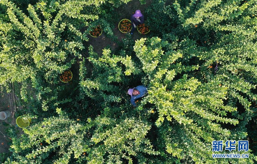 12月11日,廣西柳州市鹿寨縣四排鎮(zhèn)四排村村民在果園里采摘砂糖橘(無人機(jī)拍攝)。新華社記者 黃孝邦 攝