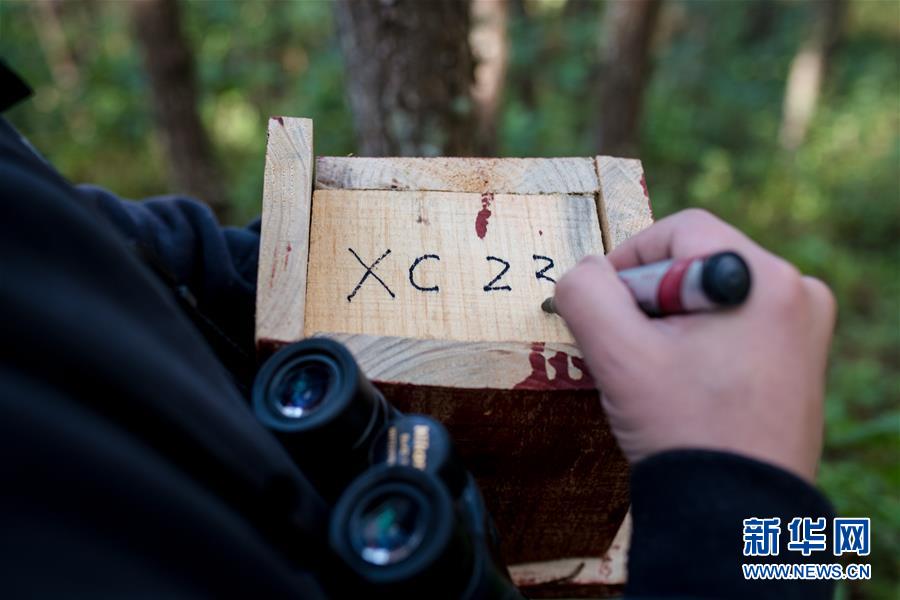 羅康在新做好的人工鳥巢底部寫下編號(12月12日攝)。 新華社記者 胡超 攝
