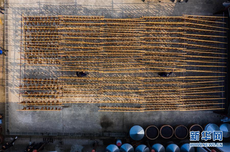 初冬時節(jié),浙江省紹興市柯橋區(qū)安昌古鎮(zhèn)開啟了傳統(tǒng)臘味制作、上市的季節(jié)。當(dāng)?shù)匕傩沼脗鹘y(tǒng)醬油、黃酒、香料等手工腌制臘腸、醬鴨、魚干、醬鵪鶉、醬排骨等紹興特色醬貨,在冬季的陽光下進行晾曬,滿街飄香的臘味也成了這座江南古鎮(zhèn)的獨特風(fēng)景。安昌古鎮(zhèn)是浙江省歷史文化名鎮(zhèn),有著一千多年歷史,比較完善地保存了古吳越地區(qū)沿襲千百年來的民俗風(fēng)情。每年大雪節(jié)氣前后,安昌當(dāng)?shù)匕傩瞻凑諅鹘y(tǒng)習(xí)俗挑選晴朗好天氣制作、晾曬傳統(tǒng)醬貨,各類醬貨顏色黑紅油亮,咸鮮適口,是當(dāng)?shù)囟镜奶厣珎鹘y(tǒng)美食。新華社記者徐昱攝