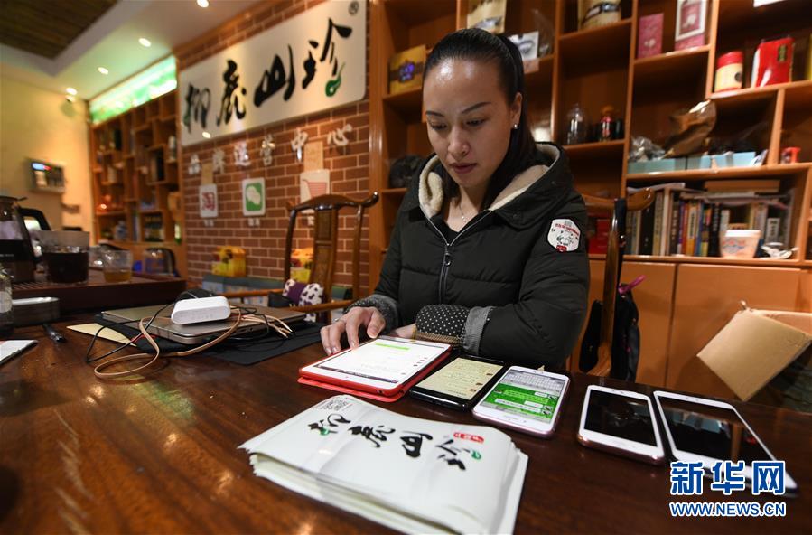 李柳萍在特產(chǎn)館里通過手機(jī)接收訂單(12月14日攝)。
