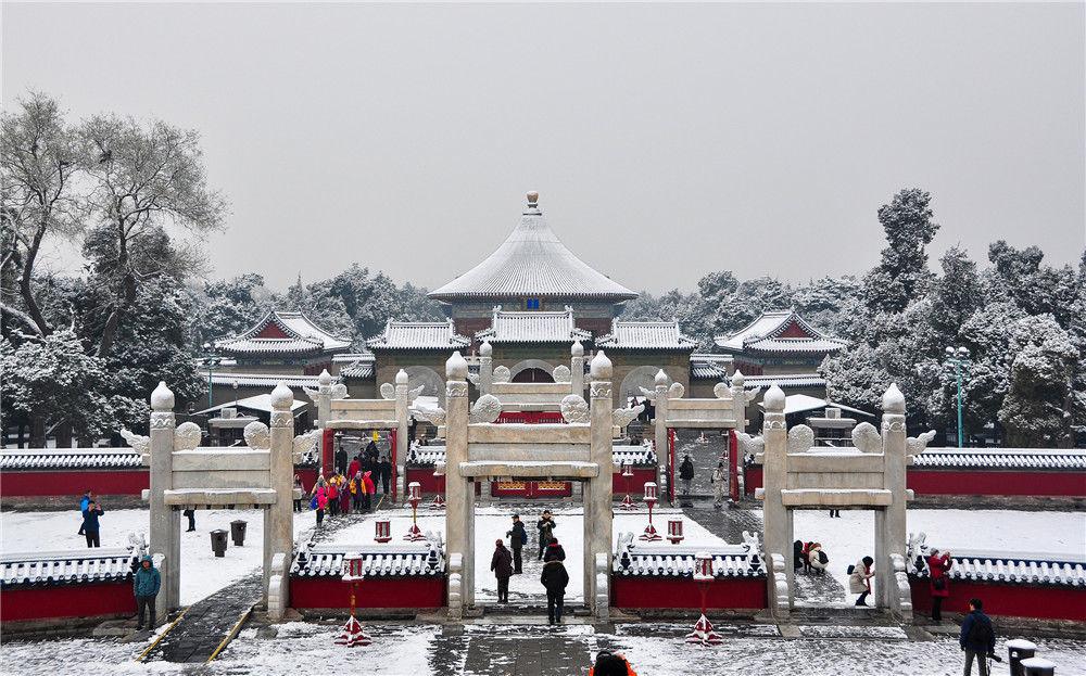 2019年11月30日,北京,初雪過(guò)后,天壇公園銀裝素裹,白雪古建相互映襯,景色迷人。天壇公園里觀雪賞景的市民絡(luò)繹不絕。喬健/千龍圖像/視覺中國(guó)