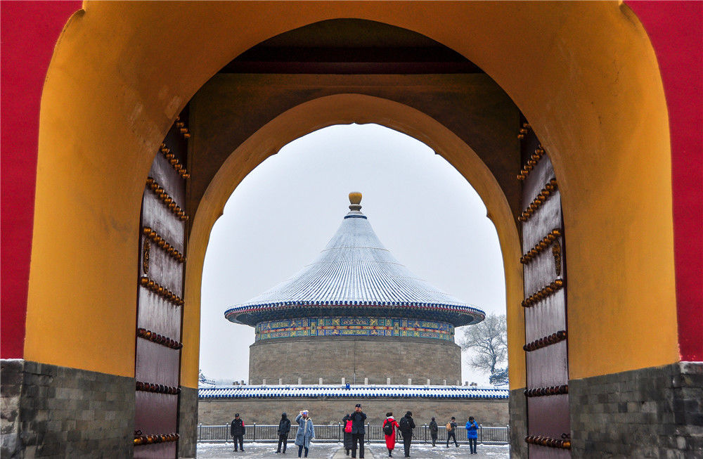 2019年11月30日,北京,初雪過(guò)后,天壇公園銀裝素裹,白雪古建相互映襯,景色迷人。時(shí)永平/千龍圖像/視覺中國(guó)