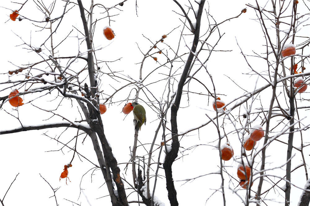 2019年11月30日,雪后的北京天壇公園內(nèi),鳥兒在柿子樹上覓食。29日,北京迎來(lái)2019年冬季初雪。富田(攝影部)/中新社/視覺中國(guó)